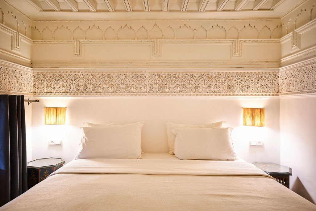 Découvrez un univers de luxe et de sérénité au cœur de la Médina de Marrakech. Nos deux suites spacieuses, la Suite Rafaele (60 m²) et la Suite Royale (75 m²), sont conçues pour un séjour d'exception. Idéales pour les familles ou les couples en quête de confort, elles peuvent accueillir respectivement jusqu'à 3 et 4 personnes. Chaque suite marie harmonieusement le style contemporain et le charme marocain traditionnel, créant une atmosphère chaleureuse et apaisante.